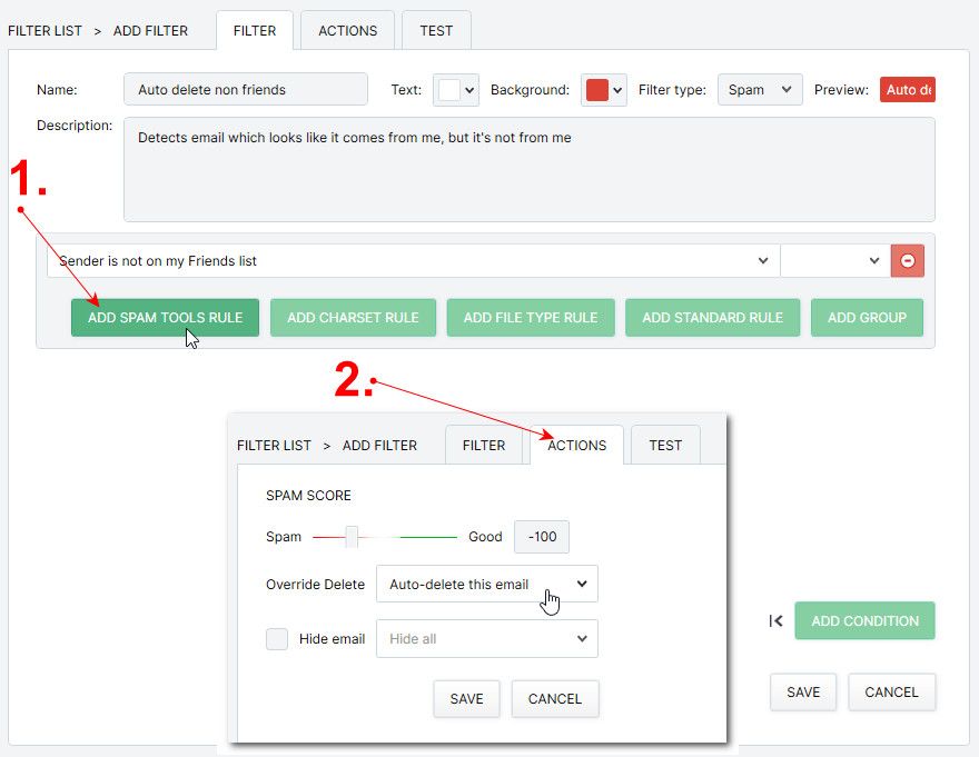 - Being specific about what emails you want auto deleted: You can set up a filter to mark certain emails or subject lines, or content to have a high spam score. When this score is exceeded, and you have turned on auto delete (Settings » Spam Tools » Spam Ratings), the email will be deleted automatically.